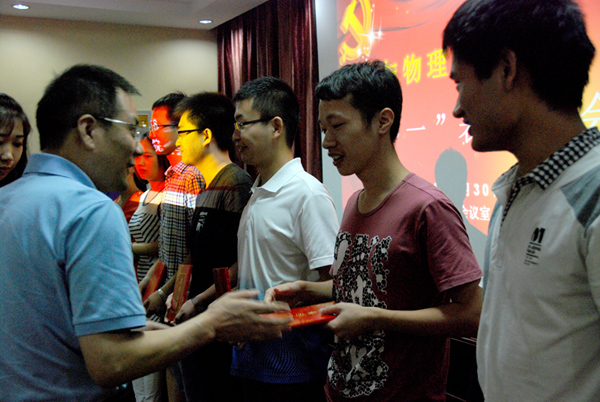 表彰大会在雄壮的国歌声中拉开帷幕,受党组织委托,李杰宣读了《数学与物理学院“七一”表彰决定》。刘治国为获得2013-2014年度校级先进基层党组织、优秀党员和优秀党务工作者颁奖,李宇凯为获得院级先进学生党支部和优秀学生党员颁奖。