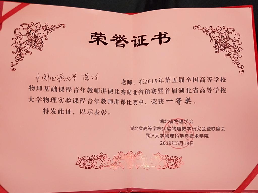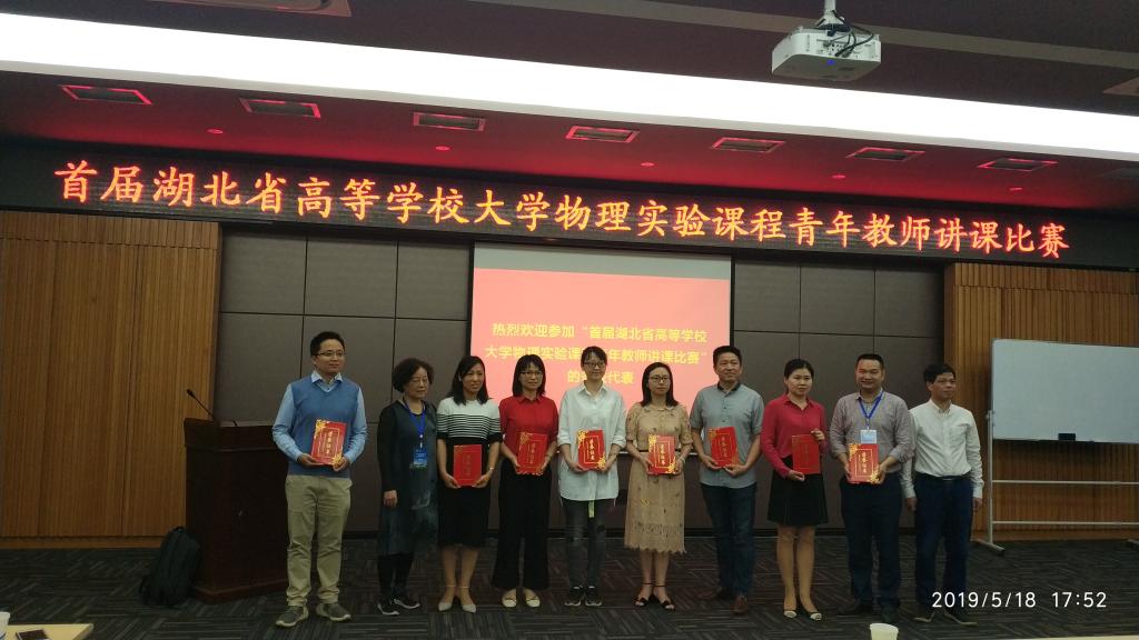 2019年5月18日,第五届全国高等学校物理基础课程青年教师讲课比赛湖北省预赛暨首届湖北省高等学校大学物理实验课程青年教师讲课比赛在武汉大学举行,我校数学与物理学院物理实验教学中心青年教师陈玲老师获得一等奖。
