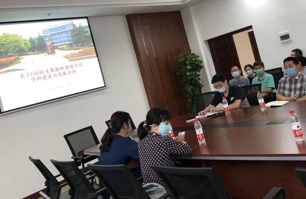 何清吟老师收集了我院SCI论文数量、论文被引频次、高被引论文、热点论文等相关数据、统计了数学与物理学两个学科的科研论文成果,并从多个角度对我院数学与物理学两个学科的科研水平、学术影响力等指标进行了全面衡量,分析了实现ESI突破的潜力与差距。我院2010年至今共发表SCI论文704篇,被引频次总计4319次,共有10篇高被引论文,其中7篇属于数学学科,3篇属于工程学。刘建辉主任建议我院教师要继续关注研究前沿,把握研究热点,合理设置奖励机制,加大高层次人才人员引进力度,挖掘中青年人才科研潜力,采取激励措施支持高水平论文的发表。