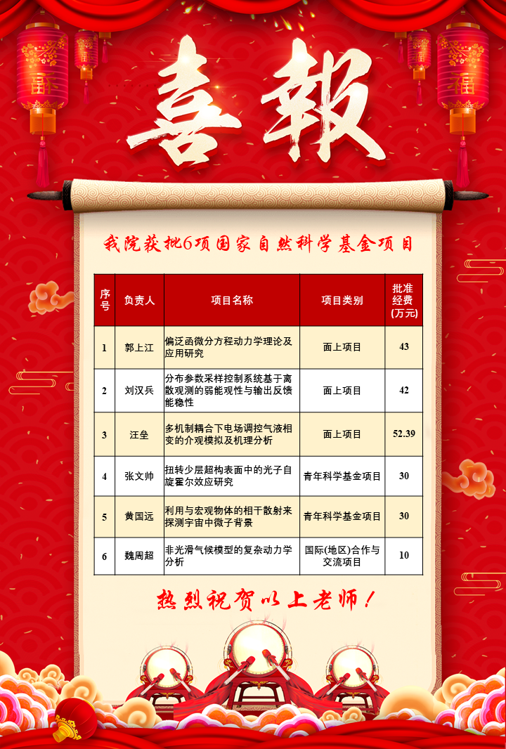 2024年8月23日,国家自然科学基金委员会公布了2024年集中接收期项目评审结果,我院共有6个项目获得立项资助,其中面上项目3项、青年科学基金项目2项,国际(地区)合作与交流项目1项。
