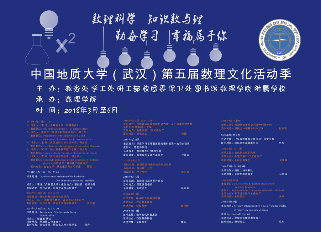 中国地质大学(武汉)第五届数理文化活动季在2018年3月到6月举行。5月10日14:30在西区久久久久国产精品楼前举行户外物理实验科普展暨数理文化活动季开幕式。