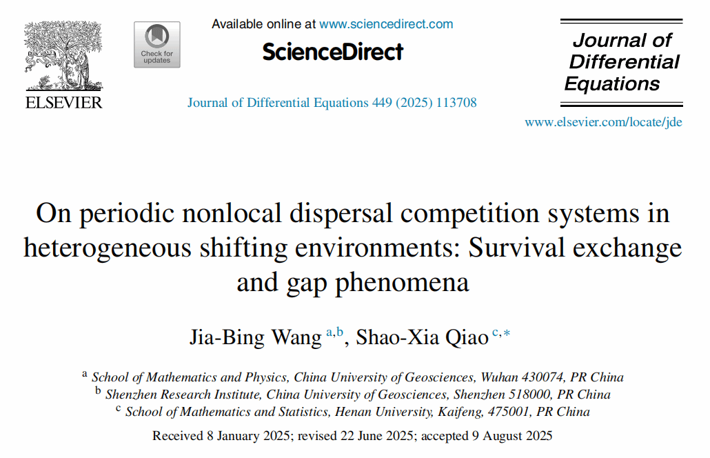 此前不久,王佳兵老师与河南大学乔少霞博士合作完成的另一项重要研究成果也正式落地:论文“On periodic nonlocal dispersal competition systems in heterogeneous shifting environments: Survival exchange and gap phenomena”成功发表于微分方程领域国际权威期刊《Journal of Differential Equations》【449 (2025), Paper No. 113708, 44 pp】。该研究聚焦种群生态学领域关键问题,深入探讨季节演替、气候变化与长距离扩散三大因素对种群竞争动态的协同影响,针对移动介质中的周期非局部扩散竞争系统,考虑了“两竞争分量的增长函数以周期性波动速度呈相反趋势变化”的场景,建立了时间周期生存交换型强迫波的存在唯一性和稳定性理论,并细致分析了系统可能出现的间隙现象。值得关注的是,该成果是王佳兵老师团队研究的延续与深化——2024年,他与兰州大学李万同教授、河南大学乔少霞博士合作针对“两竞争分量的增长函数以周期性波动速度呈相同趋势变化”的场景展开系统研究,相关研究成果已发表于《Journal of Differential Equations》【378 (2024), 399-459】,形成了对“移动介质中非局部扩散竞争系统”研究的系列化、体系化探索,为该领域理论体系的完善提供了层层递进的学术支撑。