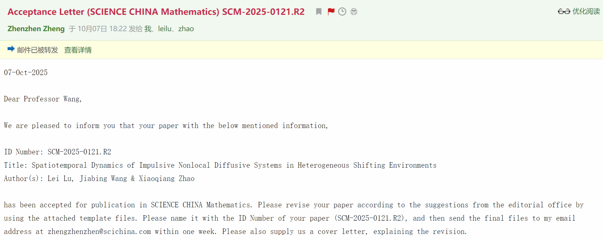 近日,王佳兵老师的研究团队再添新绩,其与指导的博士生卢雷、加拿大纽芬兰纪念大学赵晓强教授合作完成的学术论文“Spatiotemporal dynamics of impulsive nonlocal diffusive systems in heterogeneous shifting environments”,成功被国际著名数学期刊《SCIENCE CHINA Mathematics》接收并即将发表。该论文聚焦移动介质中的脉冲非局部扩散系统,针对单调与非单调两类脉冲模式下系统的动力学行为展开深入分析,清晰阐释了系统的向上收敛性与渐近湮灭性特征,并构建了完整的“饱和型”与“灭绝型”强迫波理论体系,为揭示移动环境下具有脉冲效应的非局部扩散系统的演化规律提供了关键理论依据。值得一提的是,这是王佳兵老师时隔六年再次在该权威期刊发表研究成果——2019年,他与兰州大学李万同教授合作完成的题为“Pulsating waves and entire solutions for a spatially periodic nonlocal dispersal system with a quiescent stage”的研究论文便已在《SCIENCE CHINA Mathematics》刊发。