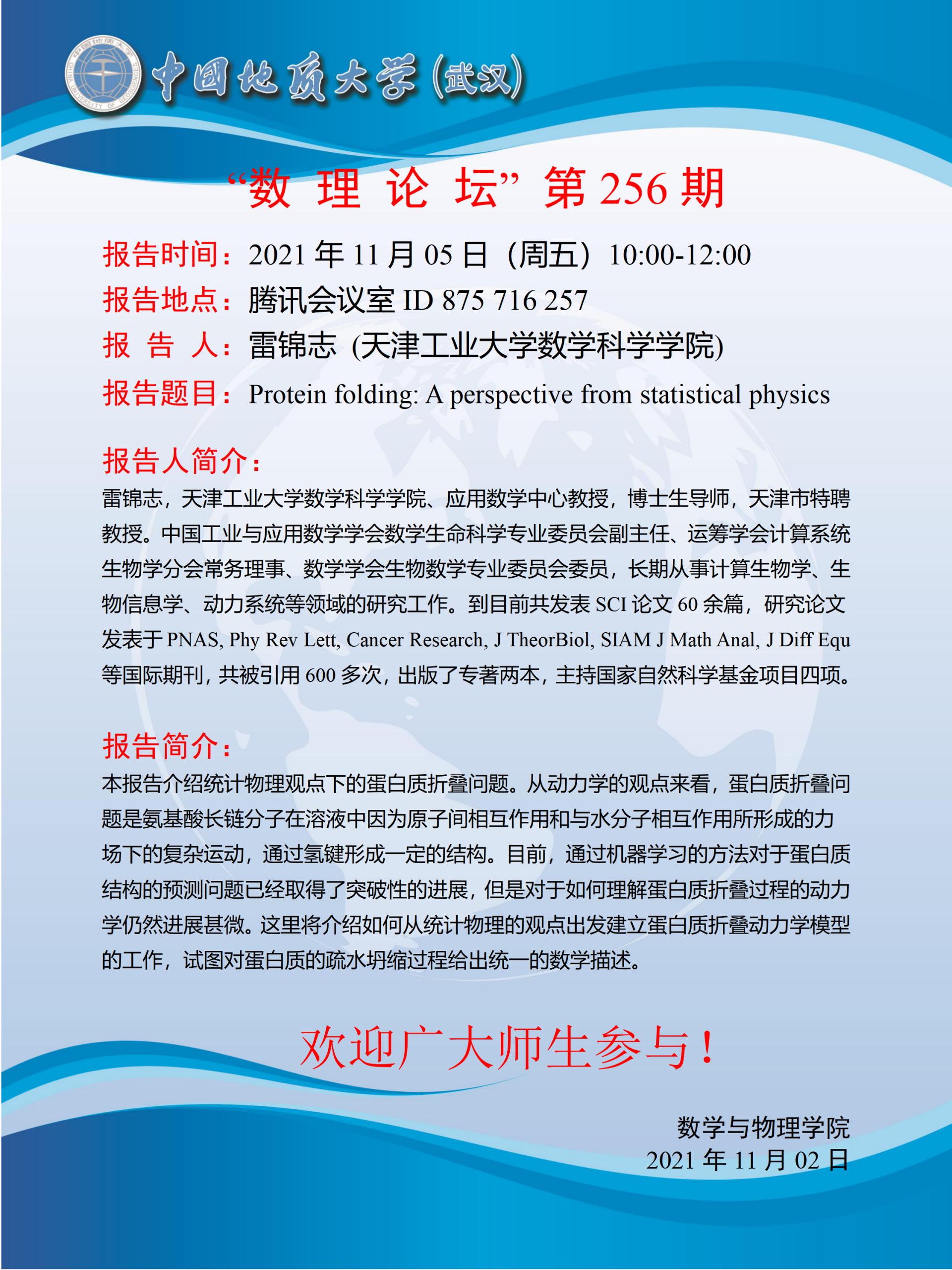 "数理论坛"第256期:Protein folding: A perspective from statistical physics