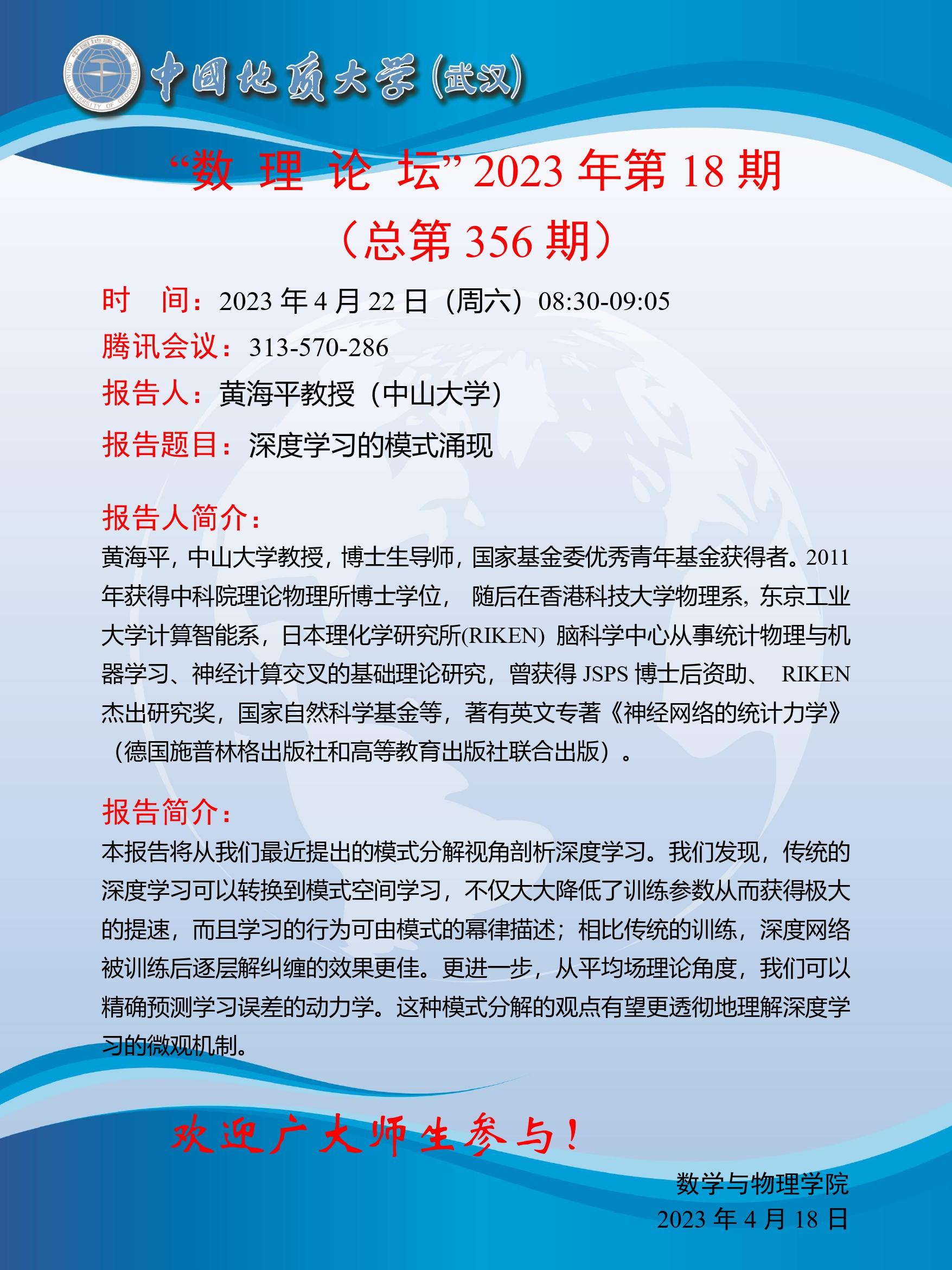2023年4月22日黄海平教授学术讲座:深度学习的模式涌现