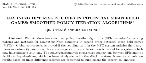 我院信息与计算科学系教师汤庆博士为第一作者的学术研究工作 “Learning Optimal Policies in Potential Mean Field Games: Smoothed Policy Iteration Algorithms” ,最近发表在国际著名期刊SIAM Journal on Control and Optimization。该论文第二作者为我院2020 级应用统计专业硕士生宋家豪。汤庆博士自2015年入职我院,主要从事动态博弈相关的偏微分方程理论、数值计算及在经济模型中的应用研究。