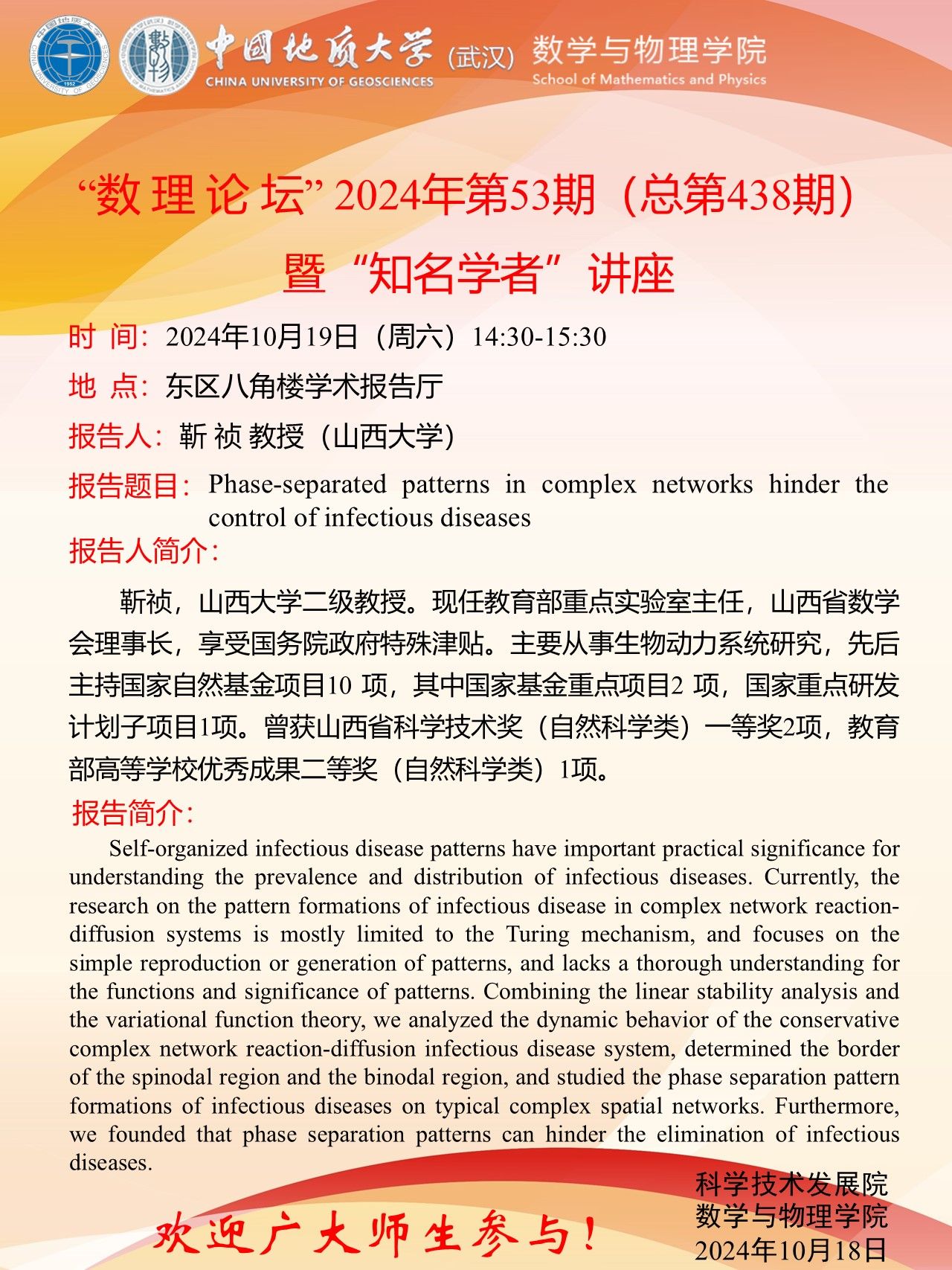 2024年10月19日靳祯教授学术讲座:Phase-separated patterns in complex networks hinder the control of infectious diseases