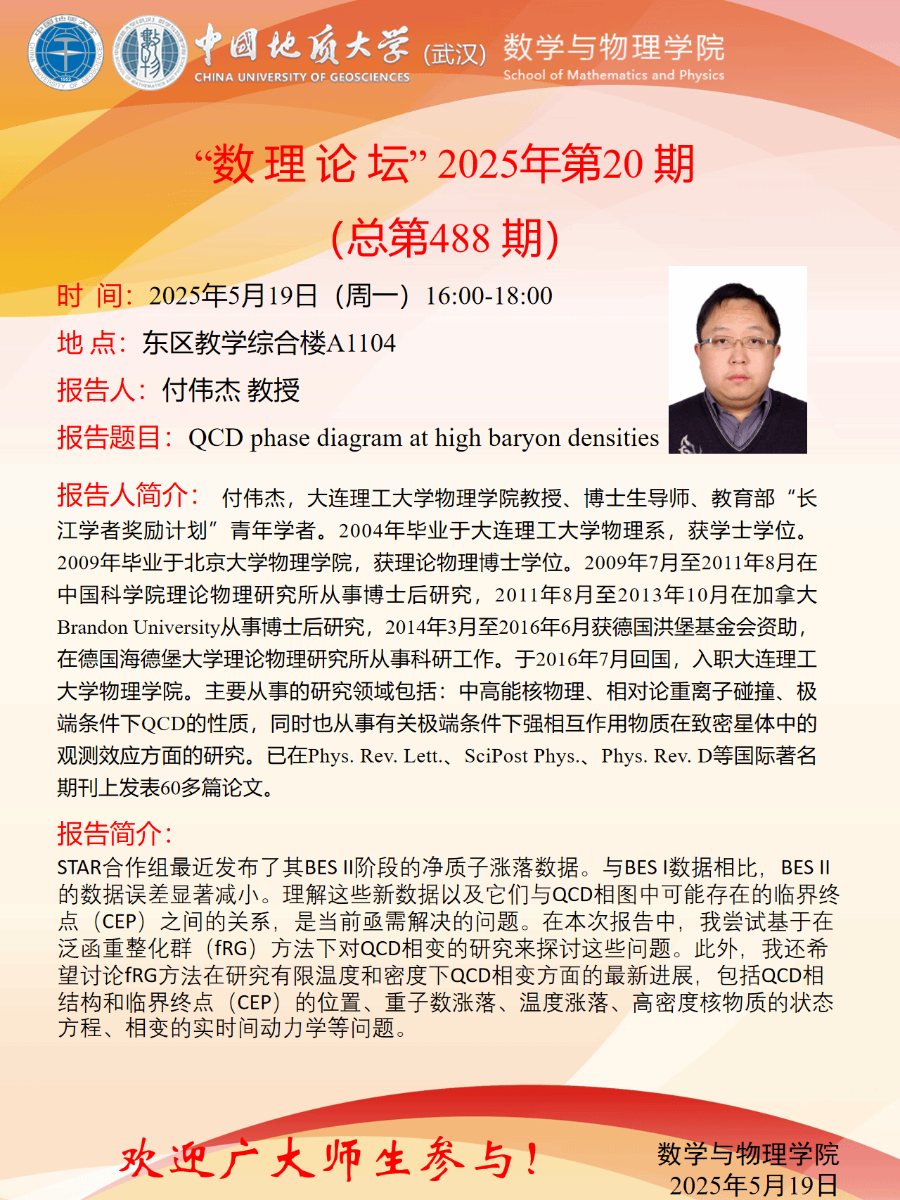 2025年5月19日付伟杰教授学术报告:QCD phase diagram at high baryon densities