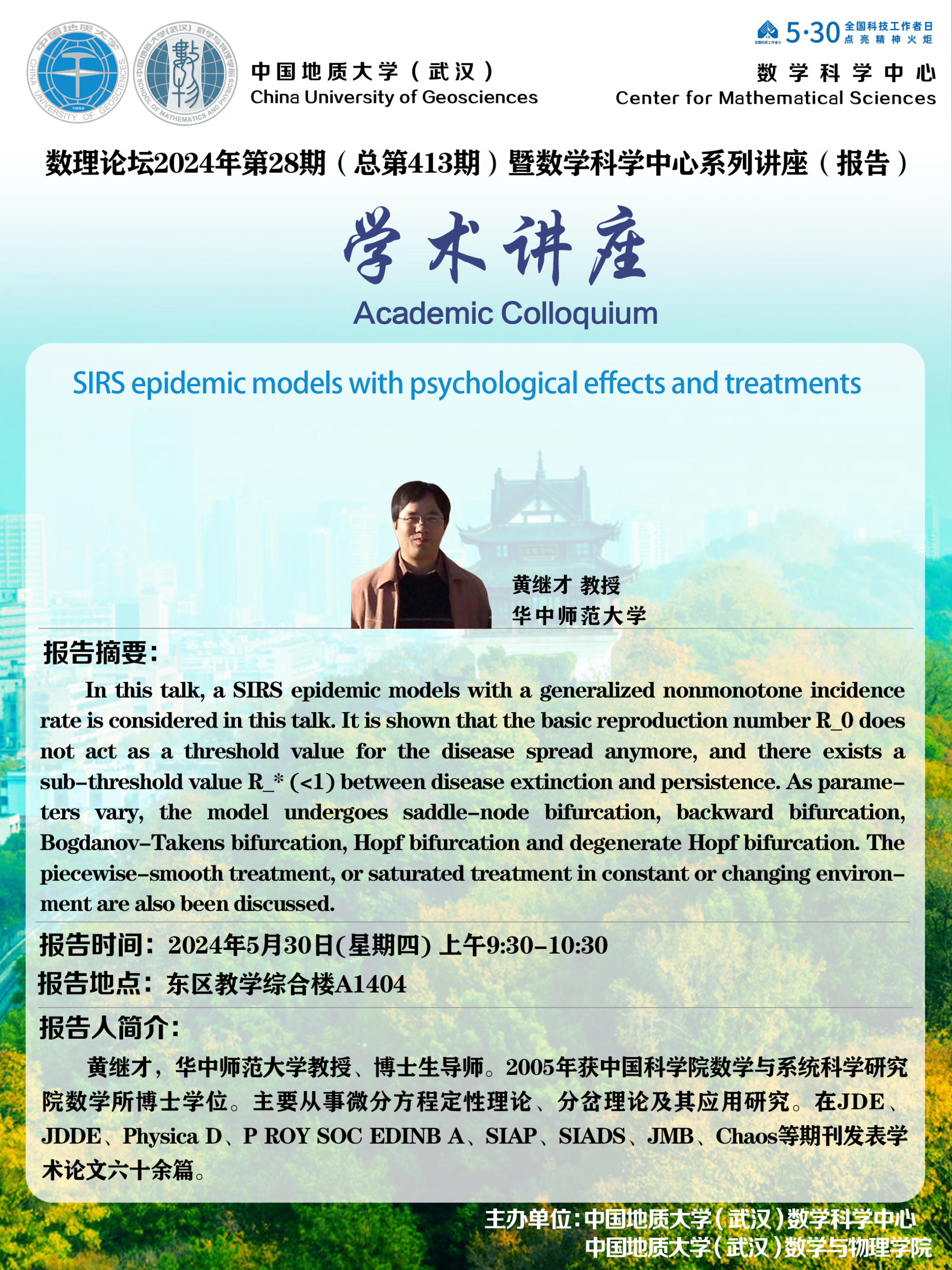 2024年5月30日黄继才教授学术讲座:SIRS epidemic models with psychological effects and treatments